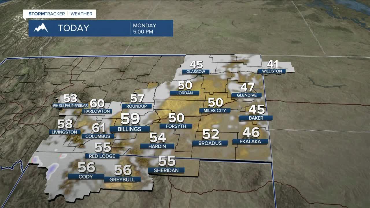 BILLINGS — Clouds increase from the south as isolated to scattered lower-elevation rain and mountain snow are possible across southern Montana and northern Wyoming on Monday as an upper low moves across Wyoming. Highs will be mainly in the 50s.