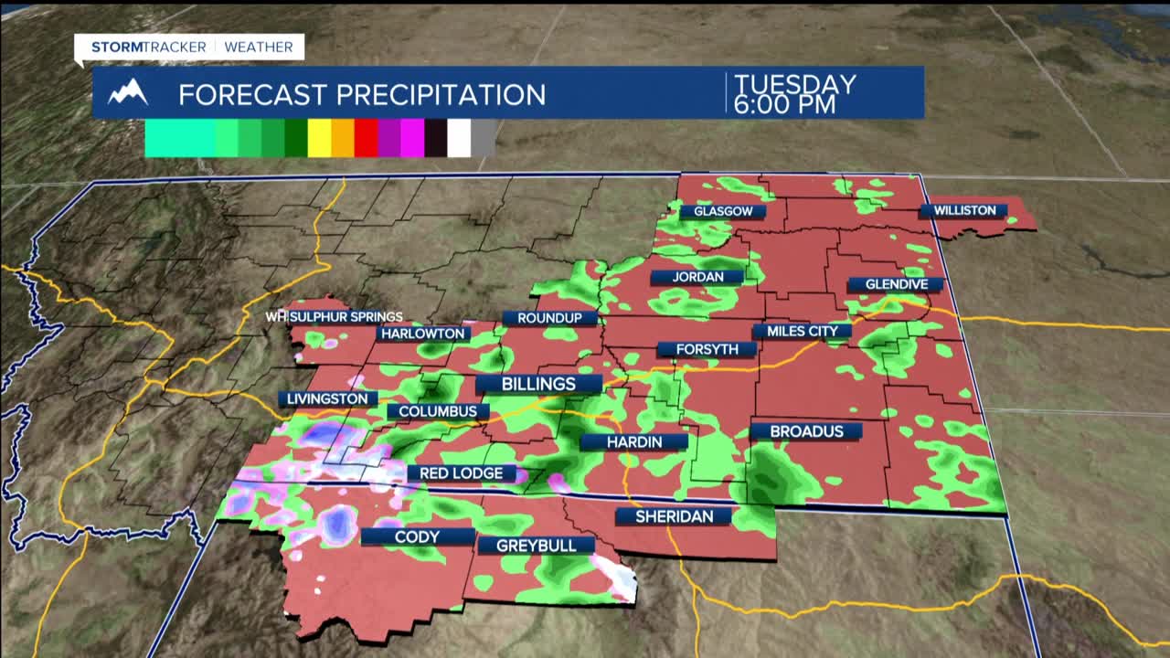 BILLINGS — THROUGH TONIGHT: Scattered snow showers are occasionally dropping visibility as they make their exit. Patchy fog is possible, especially targeting Sheridan County, Wyoming. If you're traveling through that area late Monday night or early Tuesday morning, keep your headlights ready and speeds reasonable.