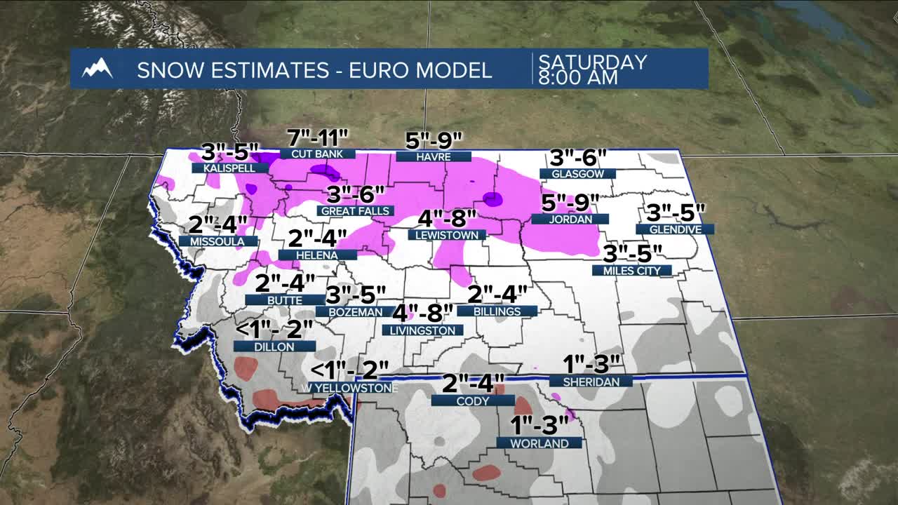 Right now, most of south-central Montana looks to land in the 1–6 inch range, with higher totals on north-facing slopes. Southeast Montana could see a bit more — places like Custer County could end up anywhere from 1–7 inches. If you look at a blend of models, generally 2–5 inches is the safer bet.