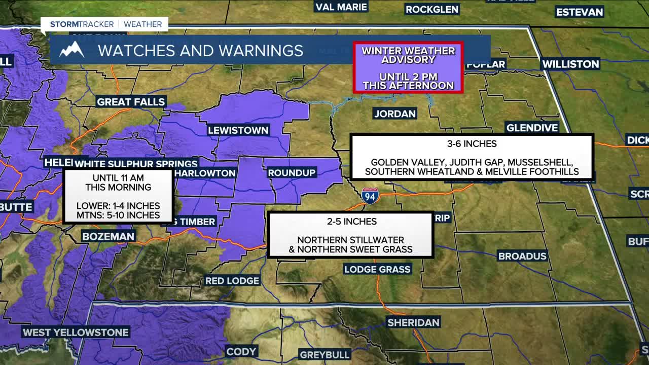A Winter Storm Warning is in effect through 5 PM Monday. The Absarokas, Beartooths, and Crazies could receive up to 2 feet of snow, while adjacent foothills, including Red Lodge, could pick up 1–4 inches. The Bighorns could get between 3–6 inches, with a few spots reaching 6–8 inches. Areas west of Billings are under a Winter Weather Advisory and could receive 2–6 inches. Billings could pick up a few inches. Precipitation will move out by Monday night.
