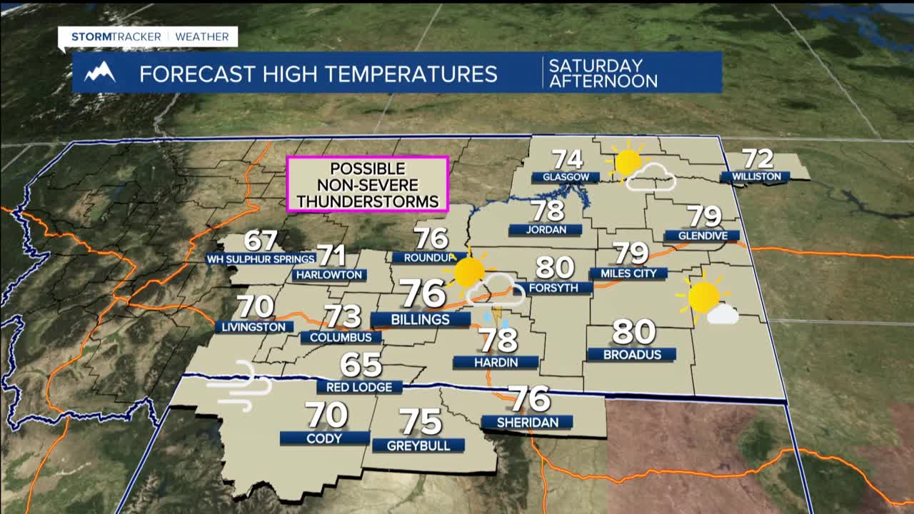 BILLINGS — SATURDAY: It will be the warmest weather of the forecast period, with highs soaring into the 70s and approaching 80 degrees, especially east of Billings. The beautiful morning and early afternoon weather takes a turn as a weather system approaches from California. Increasing moisture and instability create the potential for showers and weak thunderstorms during the late afternoon into evening.