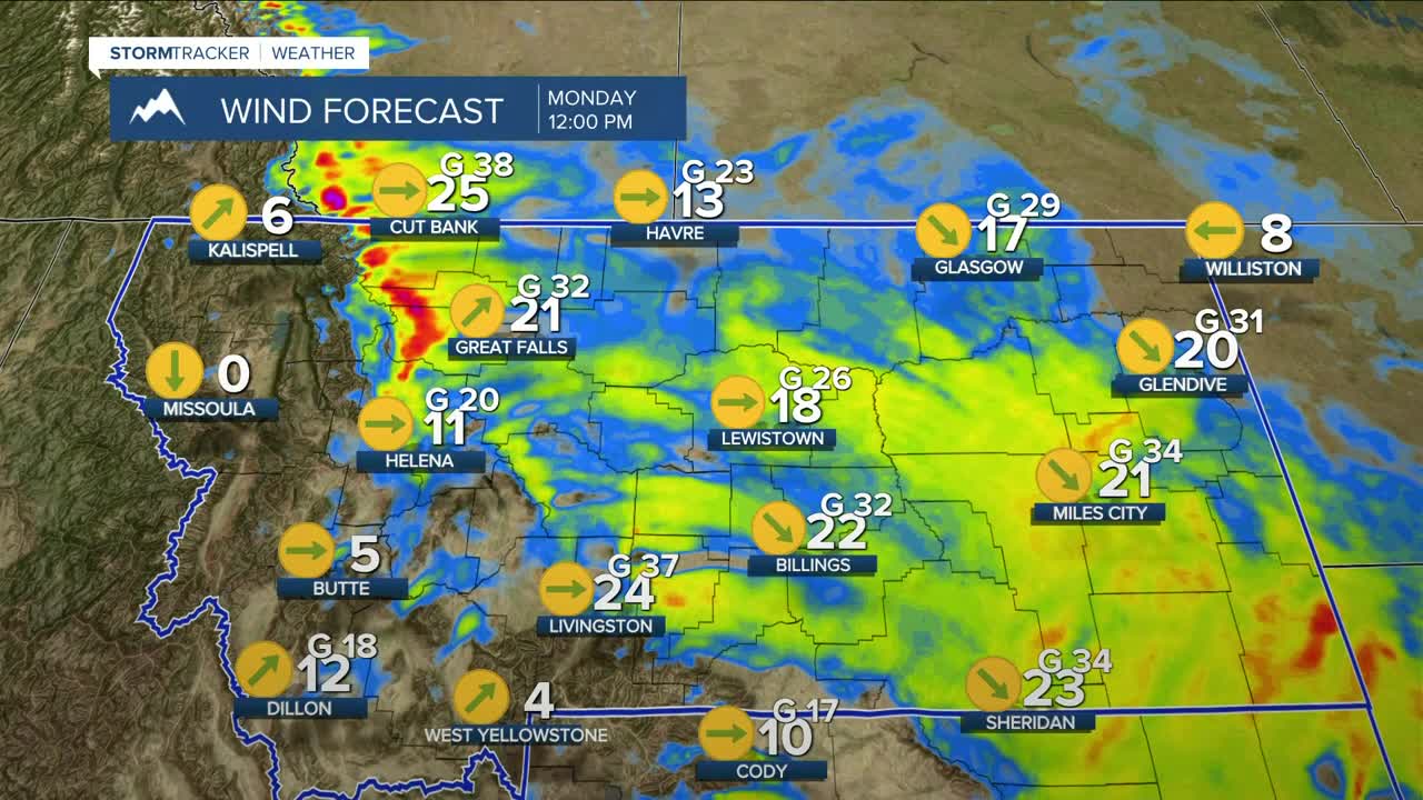 BILLINGS — The week begins on a windy note across the western foothills as a disturbance slides through, bringing gusts between 40–50 mph from Livingston to Nye through lunchtime. Gusts between 40–55 mph could also be felt from Big Timber to Harlowton through early afternoon. Gusts of 30–45 mph are possible across the plains.