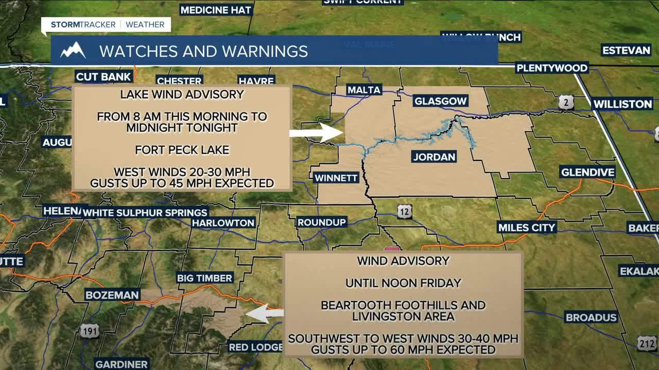 BILLINGS — The big weather story on Thursday will be the strong winds spreading across the area. Gusts of up to 55 mph will be possible along the US-191 corridor from Big Timber to Harlowton, and up to 60 mph along the I-90 corridor near Livingston, where a Wind Advisory is in effect through Friday noon. Gusts between 30–40 mph are possible elsewhere.