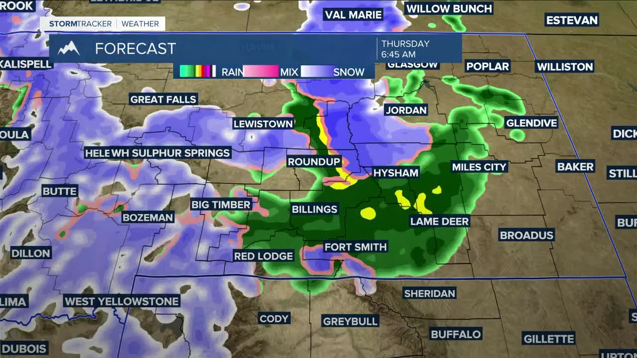 Precipitation starts as rain, then could switch to snow Thursday. Eastern Montana will be the area to watch, as cooler air could move in faster, turning rain to snow quickly and leading to possible blowing snow issues.