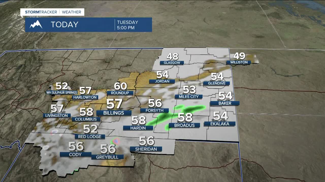 BILLINGS — High pressure ridging will keep mostly dry conditions in place on Tuesday, but a weak disturbance could bring a slight chance of light rain showers and mountain snow, with above-normal daytime highs mainly in the low to mid-50s.