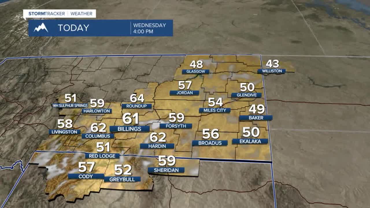 BILLINGS — Warmer-than-average temperatures will remain across the area through the weekend, with highs in the low 50s east to mid-50s to low 60s elsewhere on Wednesday. Billings and Cody, WY, will have a chance at records. Thursday will be the warmest day of the week, with highs in the upper 50s to mid to upper 60s. Many locations, including Billings, Livingston, Miles City, and Sheridan, WY, could see record warmth.