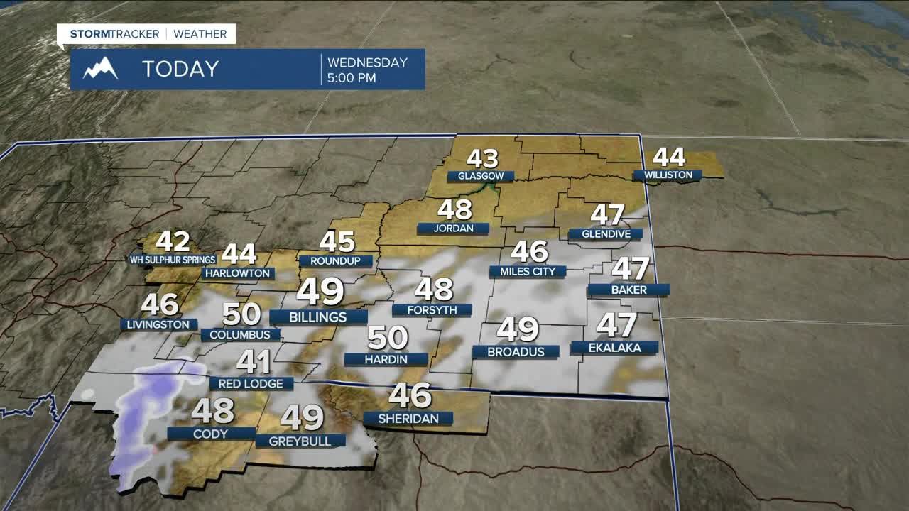 BILLINGS — The majority of the area will stay dry on Wednesday, but a shortwave coming out of the Great Basin will bring a chance of snow to the mountains through the evening, with 1–4 inches possible along the southwestern slopes of the Beartooths/Absarokas above 6,000 feet. The Bighorns could get a few inches, too. Cooke City could pick up 2–4 inches, while areas like Red Lodge and Gardiner could see light accumulation. Daytime highs will be mainly in the mid-to-upper 40s.