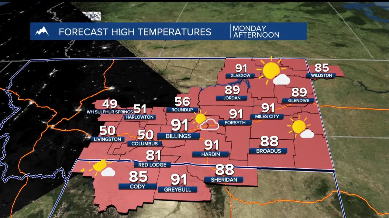 BILLINGS — TONIGHT: A slow-moving low pressure system continues its eastward drift, bringing scattered showers and isolated storms to eastern and northern Montana. As the day winds down, expect smoke and haze to drift in from western wildfires, particularly affecting foothill and mountain areas through Monday.
