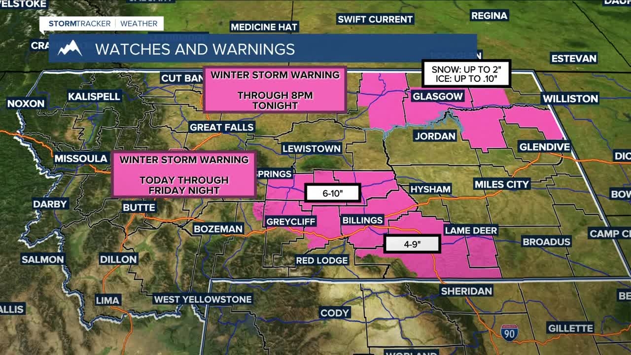 Based on current projections, snow totals could reach: Billings 4–11", Livingston 0–T, Miles City 2–10", Sheridan 1–5", Red Lodge 0.5–4", Big Timber 1–8", Alzada 3–9", Baker 1–7", Broadus 2–8", Columbus 1–8", Cooke City 2–13", Crow Agency 6–12", Ekalaka 1–8", Gardiner 0", Harlowton 4–10", Hysham 4–10", Lame Deer 5–12", Lodge Grass 4–10", Roundup 3–10".