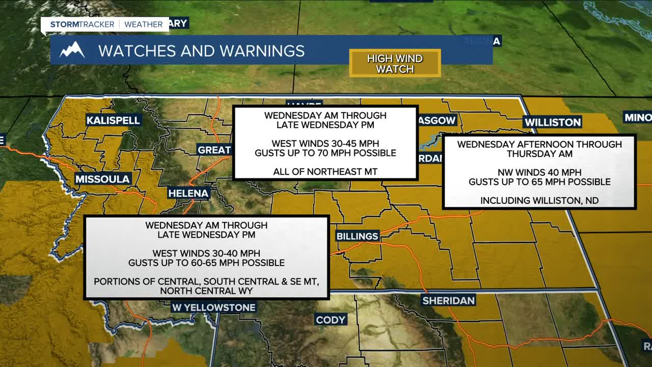 BILLINGS — Strong winds continue Tuesday morning across the western foothills, with gusts in the 50–70 mph range as pressure gradients tighten up and strong mid-level winds moved overhead. Winds will gradually during the afternoon. High Wind Warnings remain in effect through late morning or early afternoon.