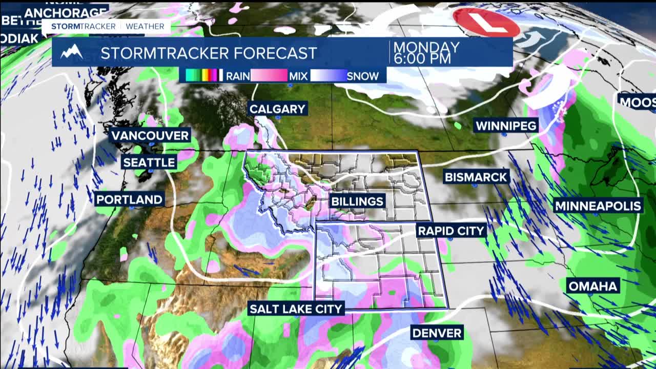 BILLINGS — THROUGH MONDAY: Light snow already developing with overnight temperatures in the upper 20s and lower 30s mean this snow will struggle to stick on pavement but could accumulate on grassy areas. Snow shifts eastward through Monday as a wave of energy approaches from the south, bringing rain changing to snow from late afternoon through tonight across the eastern plains.