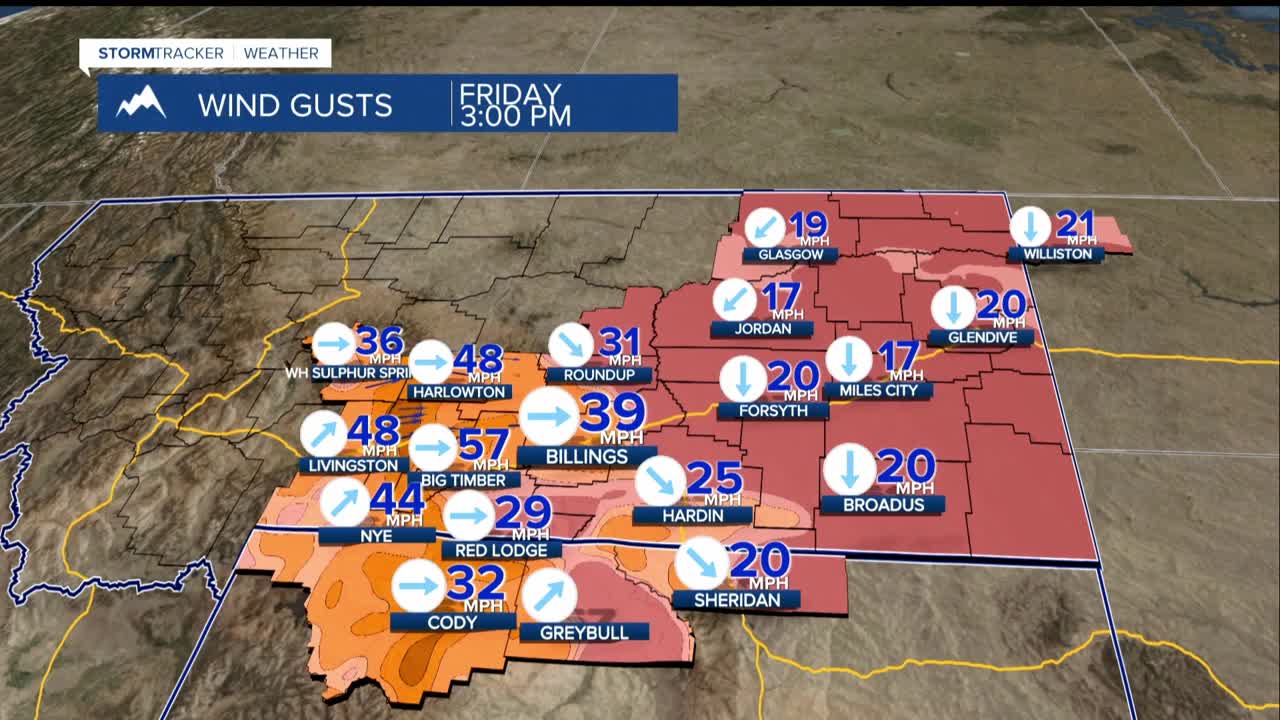 BILLINGS — WEDNESDAY EVENING THROUGH OVERNIGHT: The western foothills are finishing out Wednesday under relentless wind gusts in the 50–60 mph range. A low-level temperature inversion settles in overnight, pulling winds back into the 30s–40s mph range along the US 191 corridor.