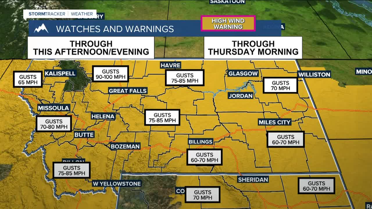 BILLINGS — Strong, widespread winds are the big weather story on Wednesday. High Wind Warnings are in effect across the region, and winds will ramp up quickly around midday. Gusts of 60 to 70 mph will be common at lower elevations, with the strongest winds capable of knocking down trees, damaging power lines, and impacting some structures. Gusts up to 80 mph will be possible in our western mountains. Travel and outdoor activities will be affected, so secure loose items and plan ahead. Red Lodge Mountain is closed due to the strong winds.