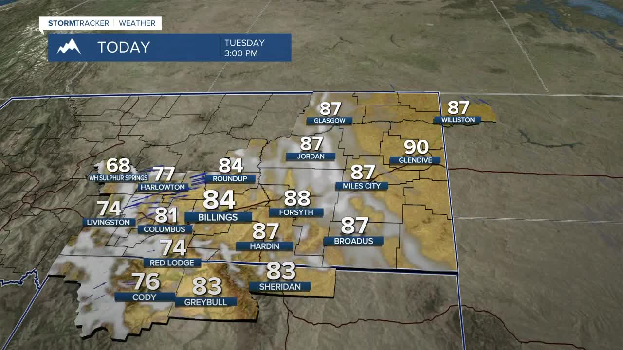 BILLINGS — While most of the area will stay dry on Tuesday, southwest flow will keep a decent chance of light showers in the forecast through Wednesday, mainly over the mountains and foothills. Billings may get a shower this evening or overnight. Highs will stay 10–20° above average through Wednesday.