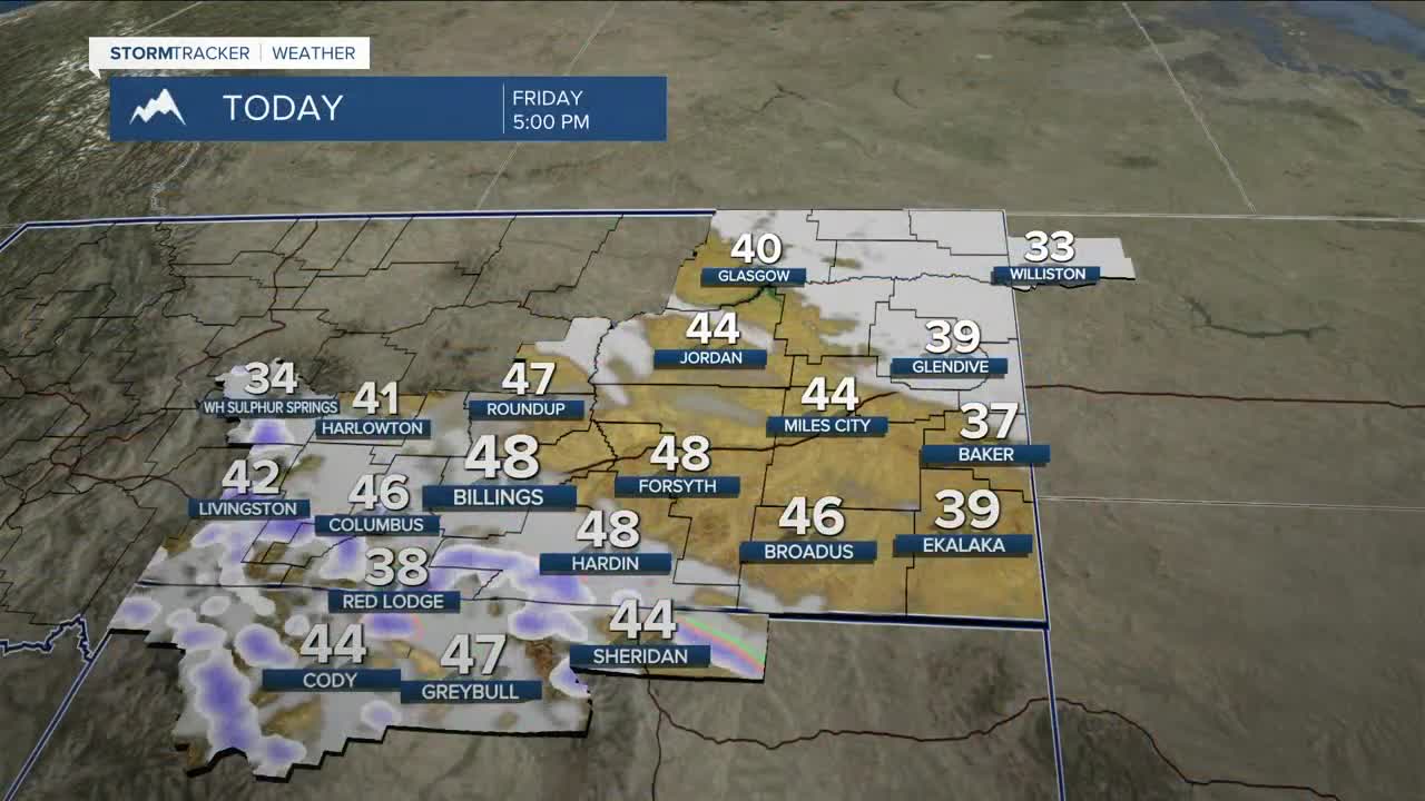 BILLINGS — As an upper-level low exits the region, scattered snow and rain showers will linger in its wake through Friday evening. The bulk of the snow will drop in the mountains, but foothills and higher hills could see minor travel impacts from the snow, too. We may even hear a few rumbles of thunder, and an isolated thunderstorm or two can’t be ruled out. Daytime highs will stay on the cooler side in the 30s and 40s.