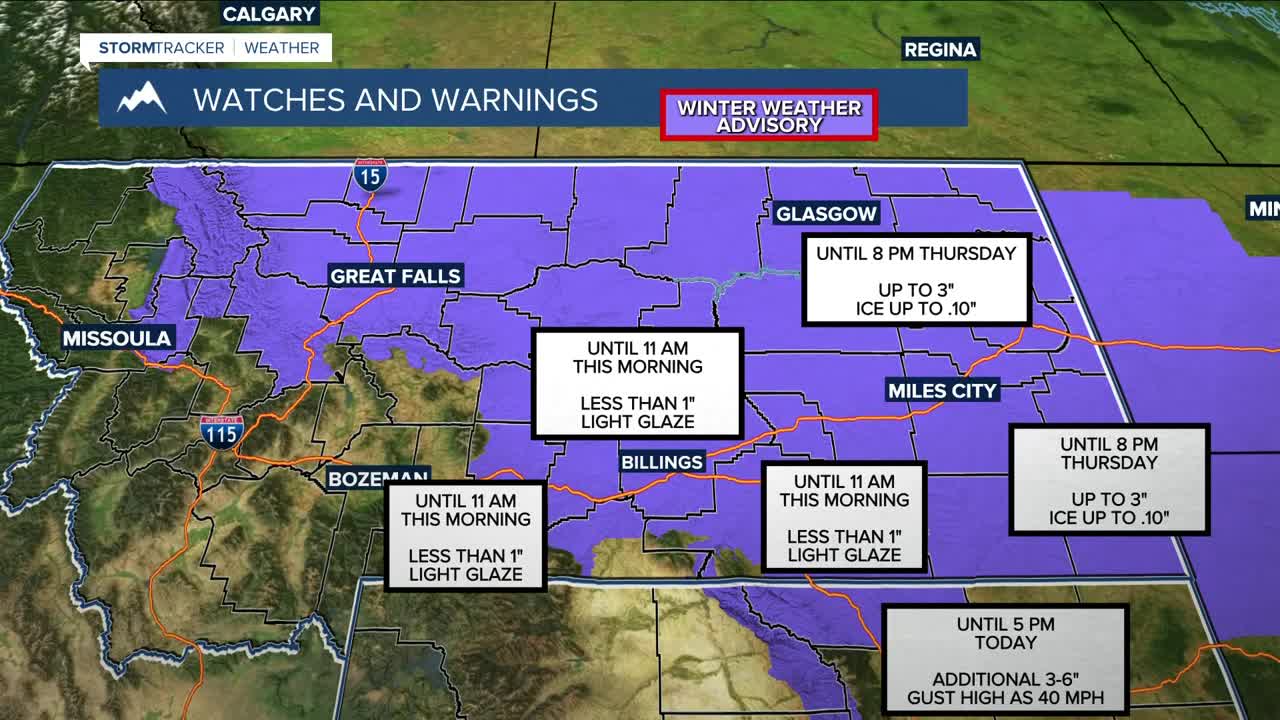 BILLINGS — A Winter Weather Advisory is in effect Wednesday morning as we wake up to snow (and possibly some ice) that will transition to rain in the afternoon as temperatures stay warmer than average. Highs will be in the 40s and 50s, but only in the 30s in our far eastern counties. Temperatures will be basically the same on Thursday.