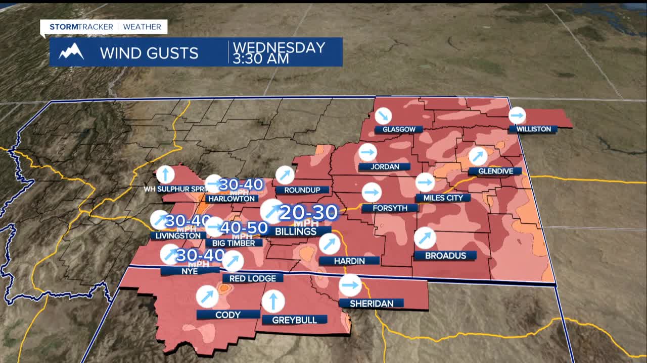 BILLINGS — Strong winds are battering the foothills west of Billings and will continue through Wednesday, with gusts reaching 35 to 55 mph. Travelers should use extra caution on Interstate 90 between Livingston and Big Timber, and on US Highway 191 from Big Timber to Harlowton.
